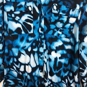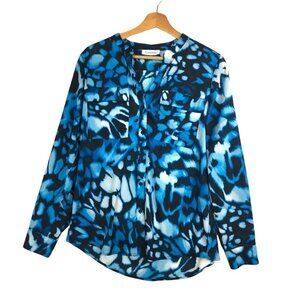 Calvin Klein long sleeve button down top features black, blue and white tye dye/paint splatter print, collarless neckline and two front pockets on chest.