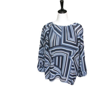 CALVIN Klein Blue/Black Geometric Pattern Sheer Sleeve Blouse Size Medium