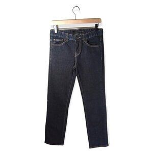 These jeans by Calvin Klein are a dark wash straight leg mid rise jean. These jeans have fabulous tan stitching on the back pockets, has a button zip closure and a 5 pocket silhouette. These jeans are in excellent condition and free from any visible flaws.