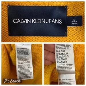 Calvin Klein Jeans Goldenrod Yellow Rolled Cowl Neck Wool Blend Sweater Womens Size M. Marled yellow rolled cowl neck sweater with contrast rib knit sleeve and trim detail. Wide cut sleeves, slightly cropped length with side slits on both sides.. 58% acrylic, 25% nylon, 14% wool, 2% other fibers. Machine wash, dry flat. In great, pre-owned condition. Measurements taken flat: pit to pit unstretched: 20", stretched: 25", sleeve length: 21", sleeve cuff width: 6", shoulder to hem length: 23", side slits: approx. 5". Earth tone, Neutral, Modest, Contemporary, Preppy, Warm, Cozy.