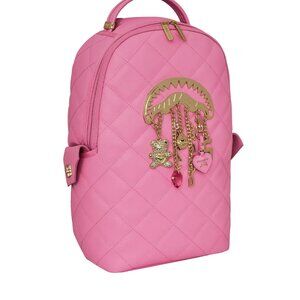 Quilted PVC backpack with gold metal sharkmouth with hanging metal and PVC charms attached. Handle with care!