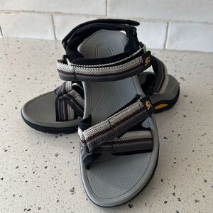 Stylish sandals with gray, black and brown stripes. Comfortable and versatile for any casual outing.