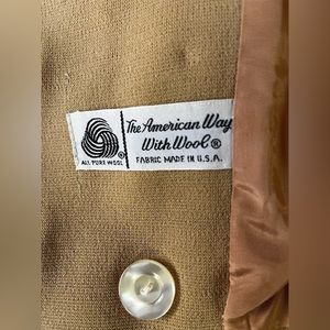 CAMEL AND WHITE TRIMMED VINTAGE WOOL JACKET WITH MILITARY STYLE BUTTONS AND PLEATED SKIRTS SET