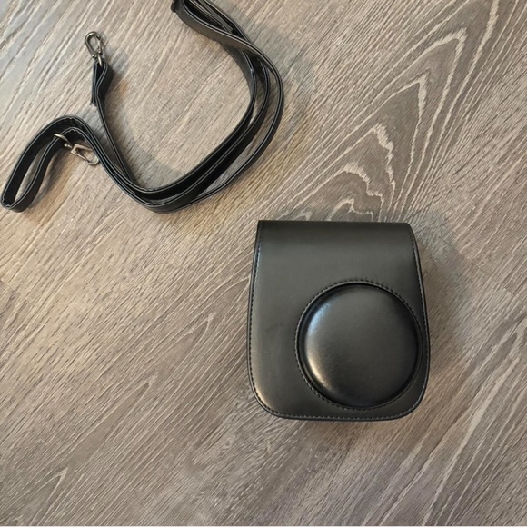 black instax mini camera holder with strap.