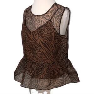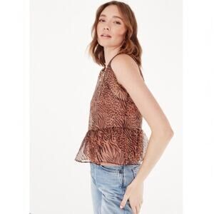 CAMI NYC Amira jungle print sleeveless top in a women’s size medium. A ruffled waist softens the walk-on-the-wild-side animal print of this adventurous little silk top. This is our new favorite day to night blouse.