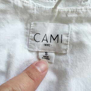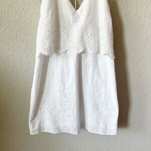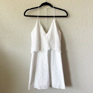 CAMI NYC The Ashley Eyelet Dress in White. Self & Lining: 100% cotton. Fully lined. Embroidered eyelet fabric. Laddered trim. Draped overlay. Mini length.
