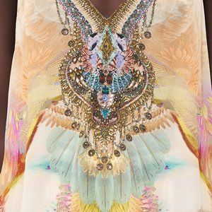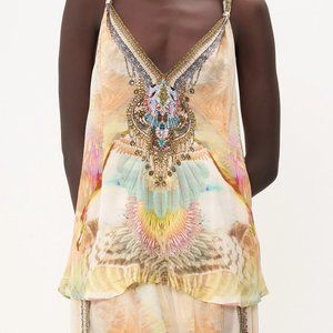 The camisole reimagined with odes to the majesties of the skies, our Take Flight Tank Top With Strap Bead Detail is a kaleidoscope of intertwining featherings adorning soft peachy hues, muted teals and vivid lemon yellow. Adorning hand-embellished CAMILLA crystals, this luxury silk top features gold hardware detailing, a relaxed silhouette that falls into a flare hemline and a classic deep v neckline.