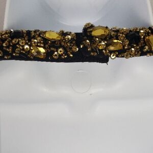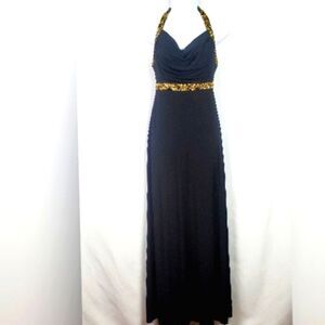 This stunning Camille La Vie black halter cowl dress features exquisite gold embellishments on the waist and neckline, perfect for any special occasion.