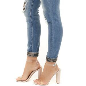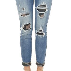 Medium Wash Distressed camo patched & cuff hem ankle jeans with camo print patch