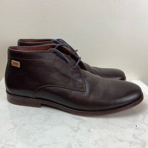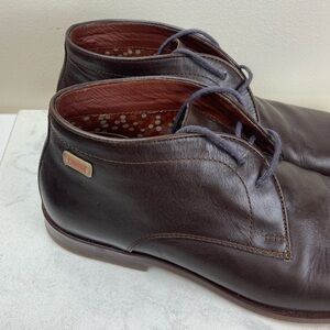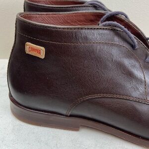 Timeless and versatile, these Camper women’s chukka boots are crafted from smooth dark brown leather with a classic lace-up front and clean silhouette. The interior features soft lining with a playful polka-dot print, and the soles include Camper’s signature rubber grip dots for traction and durability. Ideal for both casual and dressy looks.