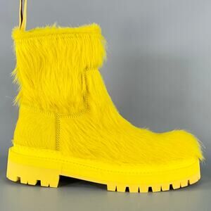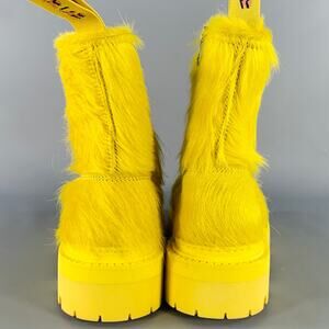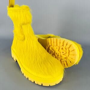 CAMPERLAB boots in a yellow leather featuring an all over shaggy calf hair design, ankle style, and side zipper closure. Made in Portugal.