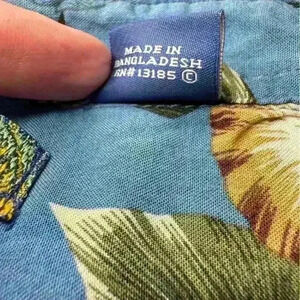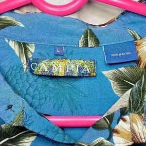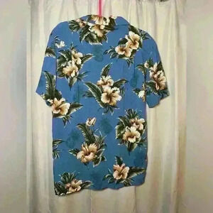 This short-sleeve shirt features an original hand painted tropical floral design on lightweight 100% rayon woven fabric with a point collar and a full button down front. Measures approximately 30 inches in length.