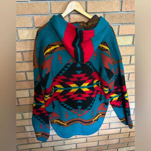 CAMPTEX 100% Wool Teal Aztec Southwest Full Zip Hooded Sweater Size XL