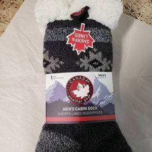 Stunning CANADA Weather Gear SHERPA LINED Men’s Cabin Socks. Toasty warm socks with grips on the bottom. Aztec pattern at the shin area right below the Sherpa Lining. There is some sticker remnants over original retail price but doesn’t take away from the purchase purpose of these comfy cabin socks.