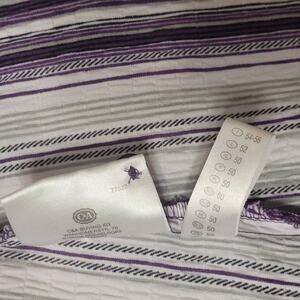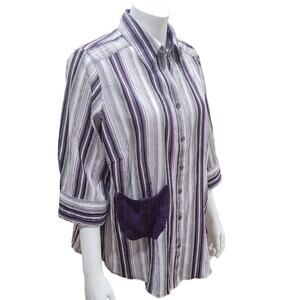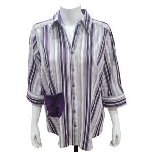 Featuring a unique textured crepe paper material and a charming white, purple, and gray striped pattern, this button-down shirt is perfect for any casual occasion. The three-quarter sleeves and clear front buttons with gray accents and purple thread add a touch of sophistication.
