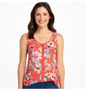 This is a Candies lightweight chiffon button-down floral tank. It is orange with blue and pink flowers on it. It is a size extra small. It has only been worn once is and is in excellent like new condition with no rips stains or tears or imperfections.