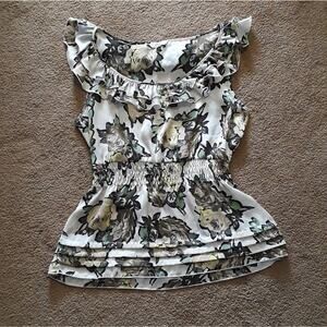 Feminine looking sleeveless ruffle top blouse w/ large floral print