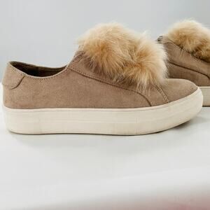 Details: Fashion sneakers in a faux suede material with fluffy pom poms. Slip on for ease.