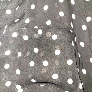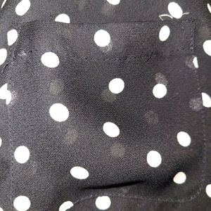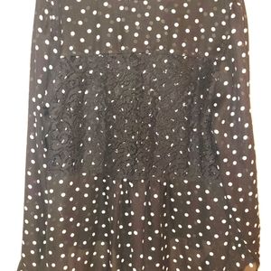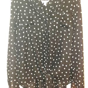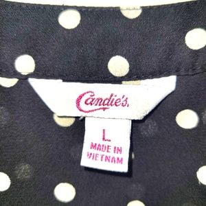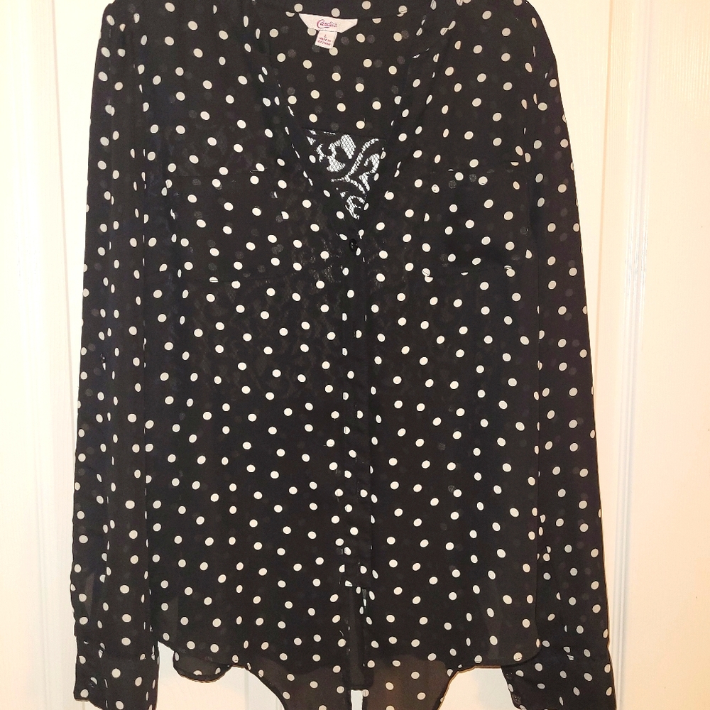 CANDIES Black with white polka dots, little pockets on left and right chest, the back is lace. The pictures are not as descriptive as i would like, but there is no tears or stains. Only worn to try on, I cant wear fits to snug☹ beautiful blouse ♥️