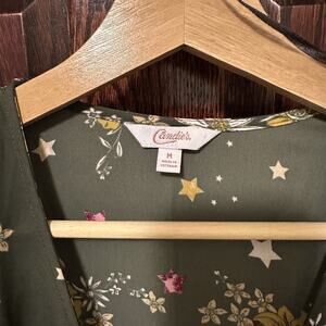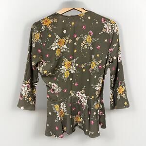 CANDIES floral wrap front tie waist peplum bell sleeve semi sheer top blouse. Size M. Polyester chiffon fabric. Army green with pink and gold.