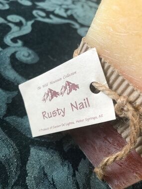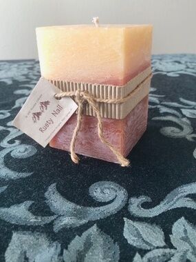 Four inch chunky candle, two tone color of rust and light yellow, frosted look.