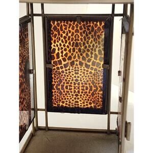 Candle holder for table or to hang. This is a gold tone matte finish metal with glass inserts. The glass inserts are on all four sides. They are a leopard print that would glow with a light candle inside. It is a 4" square, 6.75" high holder. I could hold a pillar candle. One side has a door that has a latch to close it and opens to insert the candle.
