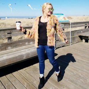 Ok where to start!? Look at this "Sherbet Delight" color combo fringe cardigan featured on black knit. It is a must have!