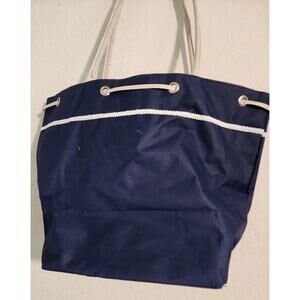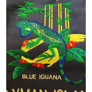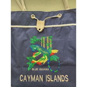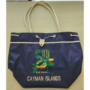 Nice beach bag or tote made of a canvas material. It has an embroidered Blue Iguana and the words "Cayman Islands" on the front. The Blue Iguana is indigenous only to Grand Cayman Island and is endangered. This bag measures 19" wide, 14" long from top of bag to bottom, it is 8" wide on the bottom. The strap drop is 11". There is one rivet missing on the top left on the front - see picture. Great bag for any occasion and to show your support for this endangered reptile.