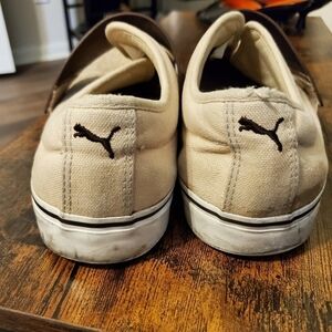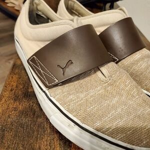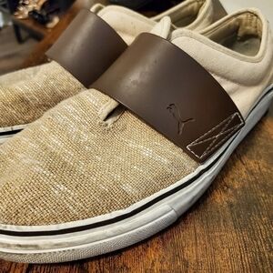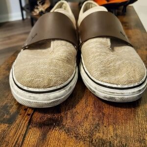 Well loved slip ons. Canvas upper with brown leather strap across front. Some marks on a few areas, I've tried to show as best I could in the pictures. Still lots of life left!