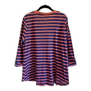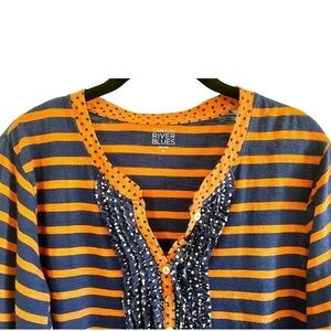 CANYON RIVER BLUES, WOMENS STRIPE TOP. V-NECK, BUTTON CLOSURE, 3/4 ROLL UP SLEEVE WITH BUTTON TAB, LONGER LENGTH BACK. NAVY BLUE & RUST COLOR. SIZE XL