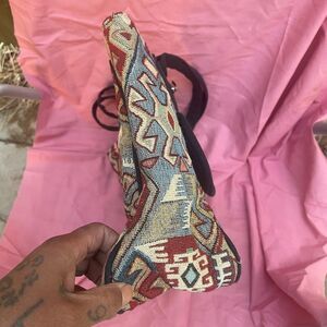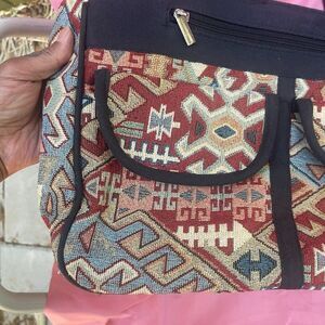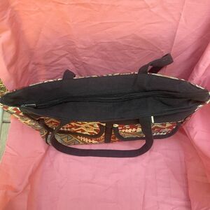 Canyon Sky bag in Southwestern tapestry and black fabric with front zip pocket, two front flap pockets with Velcro closure, zip top.
