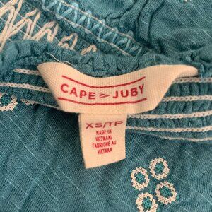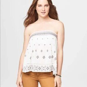 Size XS. (Extra small) WOMEN JUNIOR. Cape Juby By Aeropostale Beautiful boho look is easy breezy when you have the Cape Juby Geometric Strapless Top. Swingy style boasts lightweight fabric decorated with the prettiest embroidery, as well as shelf bra liner beneath its elasticized neckline. Relaxed fit. hippy flounce ruffle Flowy Loose Top Blouse. Blue, turquoise, and white pattern. Fun and flirty for summer! Rayon. Crop top