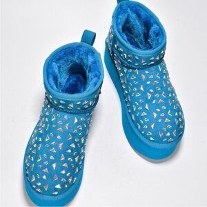 Keep your toesies warm and your wardrobe stylish with Interble! Features a lightweight design, velvety suede finish, sparkling rhinestone accents, and fur-lined interior. Plus, the 2” platform gives you an extra boost. NOTE: the stock photos have a lighter blue hue, but please see pics of actual item - they are dark blue.