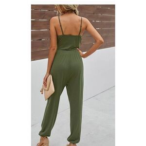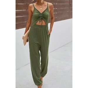 CAPELLA LIGHT OLIVE GREEN JUMPSUIT SIZE LARGE. COMFY AND LOOSE WIDE FIT: Flowy and relaxed jumpsuit made to fit all body shapes, sizes, and allows for easy unrestricted movement. Wide leg fit creates beautiful flowy movement when walking.