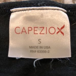 CAPEZIO ‘Barre Chic’ logo Razor Back Tank Top Black with white lettering. Woman’s Size Small. Missing tag but almost certain 100% Cotton. Has rolled bottom. Measures 15” across the chest and is 24” in lenght. Used but in great condition!