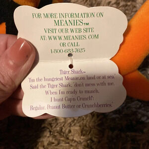 Special edition Tiger Shark "Meanie Baby", 1998.Item was part of a special mail-away promotion through Cap'n Crunch cereal.Comes with original tags featuring the traditional "Meanie Baby" limerick.Measures 8 1/2" long.