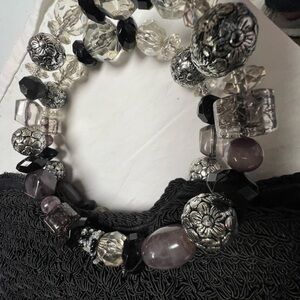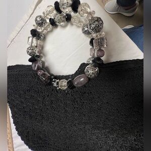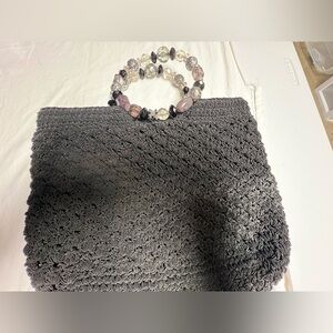 CAPPELLI WOVEN BAG WITH JEWELED HANDLES OF BLACK, SILVER & CLEAR BEADS
