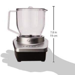 The Capresso Froth Max Milk Frother is a BPA-free, clear pitcher that can hold up to 8 oz of frothed or 12 oz of heated milk. It has three temperature settings: warm, hot, and cold. The heating disk prevents scalding.