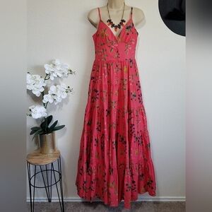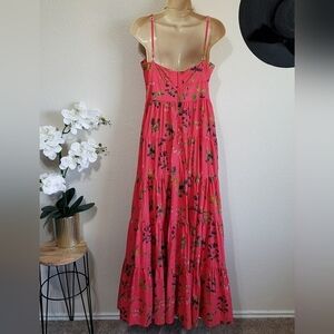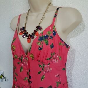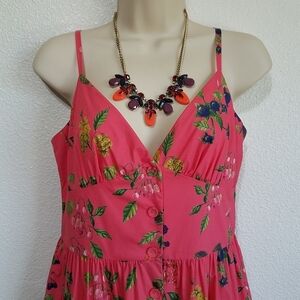 NWT, full ruffled/pleated, pockets, adjustable straps, button down the front and back zipper, not lined, fruit print, v-neck, extra button, 100% cotton, size medium.