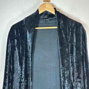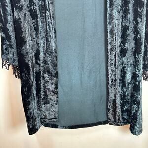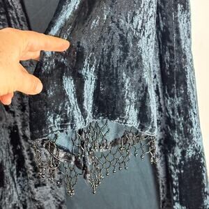 Item Description: Long blue black duster with beaded bell sleeves, crushed velvet, witchy goth style.