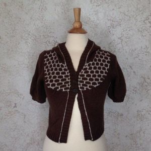 Cute Small brown and white hooded sweater by SO. Worn once, excellent condition. Features a honeycomb pattern at the collar, with a hoodie. Closes at the top with three brown buttons. Short Sleeve.