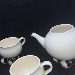 The 1976 Care Inc handmade ceramic walking sneaker teapot is a unique and charming tea set featuring a white color and a ceramic material. This teapot has a capacity of 3 cups and includes a creamer and sugar bowl, making it a functional and stylish addition to any kitchen or dining room. The lid of the teapot may have some cracks, but this adds to its rustic and handmade appeal. Perfect for tea enthusiasts or collectors looking for a one-of-a-kind piece to add to their collection.