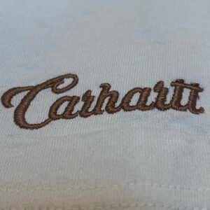 Light tan, loose fit, rib neck , left chest pocket , CARHARDTT logo script, tagless neck label, high quality fabric, please see measurements for a good fit. The T- Shirt with a feminine touch! Can bundle with other western items in closet .