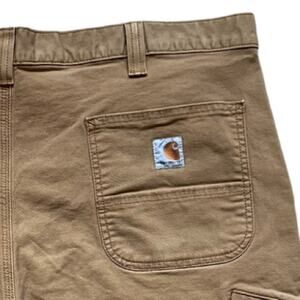 Classic CARHARTT Relaxed Fit Carpenter Style Shorts. Tan cotton zip fly, front and back pockets.