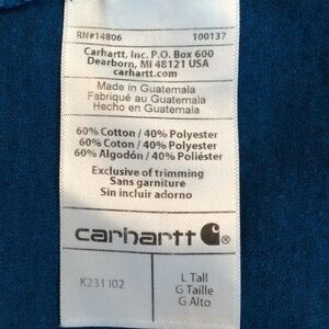 Carhartt Men’s Pullover, Size L Tall, Cobalt Blue. Shoulders 21.5”, Chest 22.5”, Sleeves 27.5”, Length 32”. Good Condition. (105)