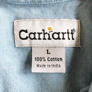 Carhartt mens short sleeve chambray shirt. Blue, button down front, 2 front pockets, size large, 100% cotton. Excellent pre-owned condition, no flaws or defects. Smoke and pet free home.