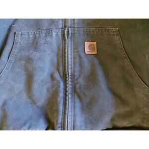 The Carhartt Vintge Hooded Q J130 Mos Jacket in size XL is a classic and durable outerwear piece designed for men. Made with a cotton canvas outer shell and has a quilted liner with polyester, this mid-length jacket features a hood and zipper closure, making it suitable for various outdoor activities. The vintage design in a solid green color adds a touch of style, ideal for workwear or everyday use. Made in USA and Mexico both. Flannel on the inside has some pilling, exterior is in amazing condition.