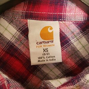 CARHARTT Women's Size XS Button Down Collared Pink Plaid Casual Shirt in Flannel material. It features a classic Long Sleeve with a Western-inspired design, complete with a logo accent. This shirt is suitable for a variety of seasons and occasions, offering a comfortable fit with easy care instructions. Perfect for those who appreciate a Western, ranch, or country style.