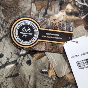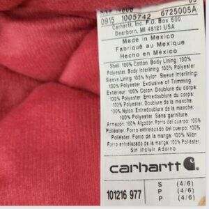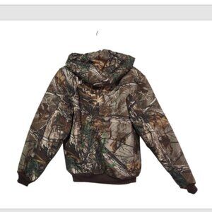 The Carhartt camo Realtree hooded pink quilt lined jacket in Women's size small is a versatile and stylish outerwear option for women. Made from cotton canvas with a polyester lining and insulation, this active jacket is perfect for casual or workwear occasions in the winter, fall, and spring seasons. Featuring a camouflage pattern with pink embroidery, this jacket includes inner and outer pockets, a hood, and a zipper closure for added convenience. The Carhartt brand is known for quality and durability, making this jacket a practical and fashionable choice for those who enjoy outdoor activities