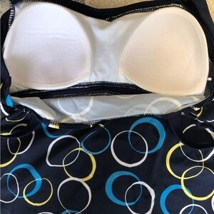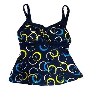 CARIBBEAN JOE - Navy Blue Tankini Tank Top w/ White, Turquoise & Yellow Circles and Adjustable Thin Straps - Size 10. No visible flaws. Excellent pre-owned condition.